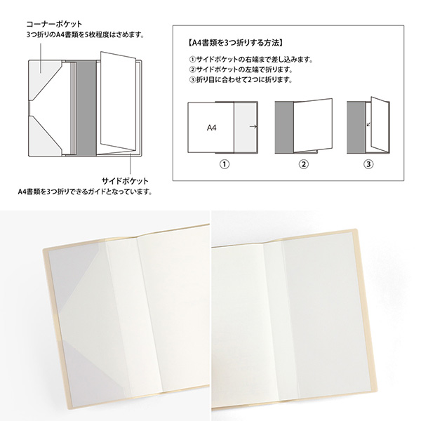 カバー右のサイドポケットにはA4サイズをきれいに3つ折りできるガイド機能があります。きれいに折るのが意外と難しい3つ折りが簡単にできます。